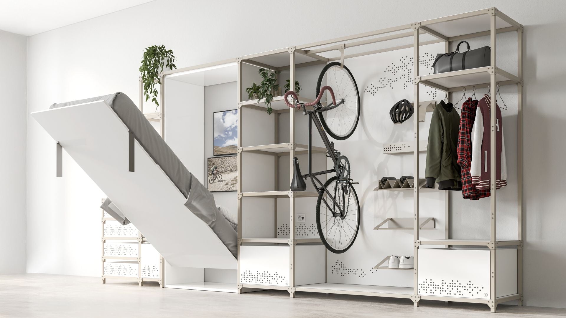A bedroom furnished with a multifunctional wall that provides safety and convenience for storing sports equipment such as bicycles, skis and surfboards, meeting the needs of sporty guests.Modular in size and functionality, the active room can be adapted to rooms of any size.
