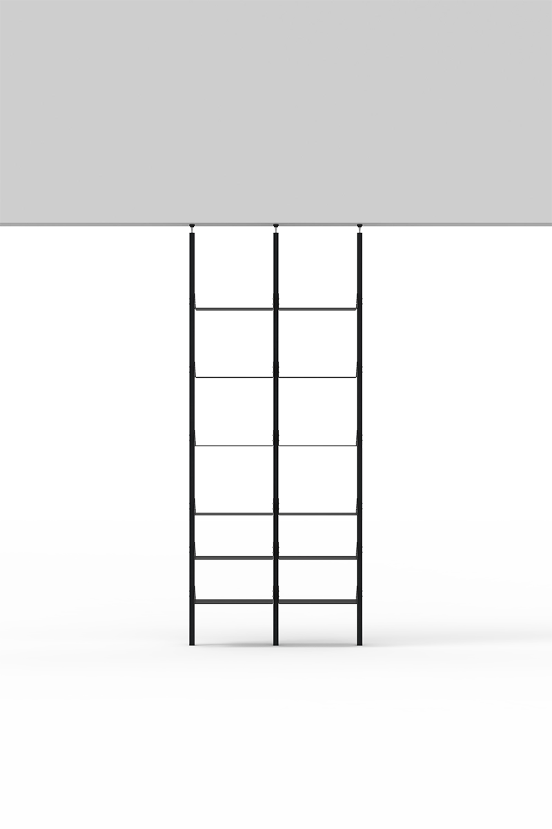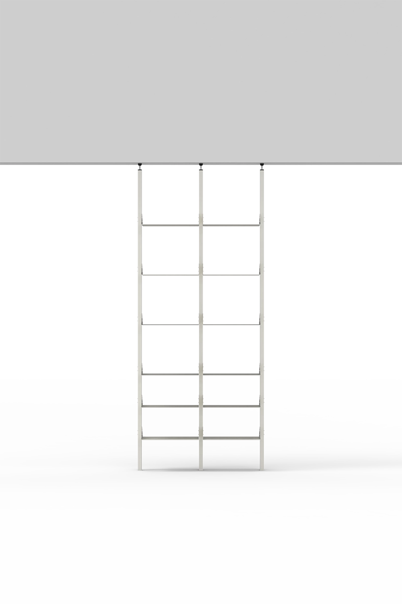 The Vela partition bookcase is installed between ceiling and floor and includes adjustable plastic feet to allow for precise height adjustment and secure tensioning of the uprights. The bookcase can be fixed to the wall by hooking systems provided. The shelves are fixed by screwing them to the uprights and the accessories are placed on the shelves.