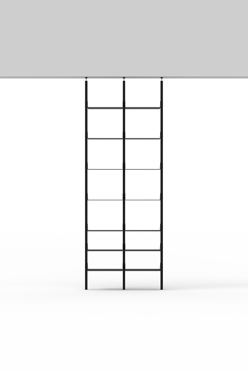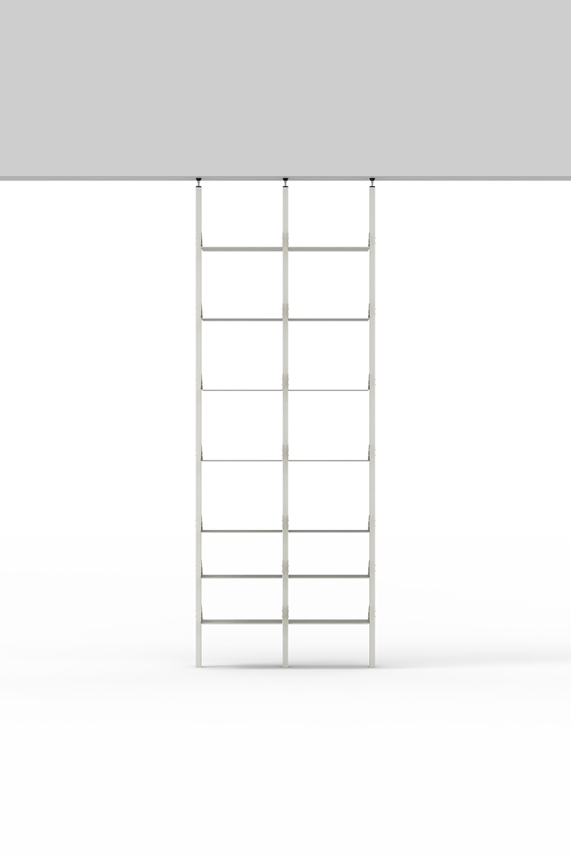 The Vela partition bookcase is installed between ceiling and floor and includes adjustable plastic feet to allow for precise height adjustment and secure tensioning of the uprights. The bookcase can be fixed to the wall by hooking systems provided. The shelves are fixed by screwing them to the uprights and the accessories are placed on the shelves.